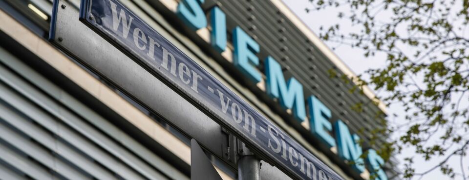 The Siemens AG headquarters stand near a Werner-von-Seimens Strasse street sign during coronavirus lockdown in Munich, Germany, on April 16. The company aims to produce 50 million Covid-19 antibody tests per month.