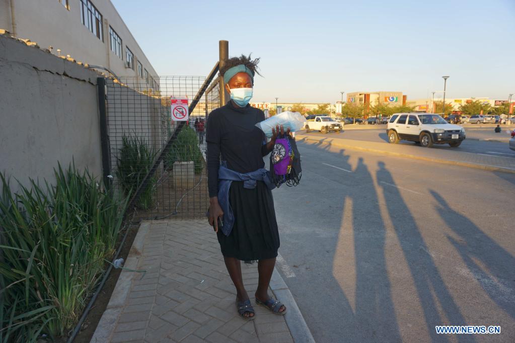Precious Chisulo, a face mask reseller, waits for customers at the entrance of a shopping mall in Lusaka, Zambia, on July 3, 2021. Although the majority of people in Zambia are now aware of the danger of COVID-19, the wearing of face masks correctly has been one of the challenges for many communities. (Photo by Lillian Banda/Xinhua)